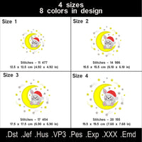 This sweet Christmas Bunny Embroidery Design shows a little rabbit sitting on the moon in a Santa hat with stars all around. Easy to stitch, perfect for holiday projects, baby items, or festive apparel.