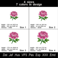Add a touch of elegance to your embroidery projects with this stunning peony flower design. Featuring detailed satin and tatami stitching, this large floral embroidery file brings any fabric to life — from home decor to fashion accessories. Comes in multiple formats for most embroidery machines.