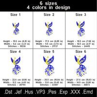 This embroidery design features a graceful bird in the colors of the Ukrainian flag, flying upward with flowers and stars trailing from its wings and tail. A poetic and powerful symbol of Ukraine. Perfect for shirts, bags, patches, and decor. Instant digital download.