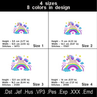 Adorable unicorn embroidery design running across a rainbow with clouds and stars – perfect for baby girl clothes, pillows, bags, or nursery decor. A sweet and magical addition to your embroidery collection. Instant digital download.